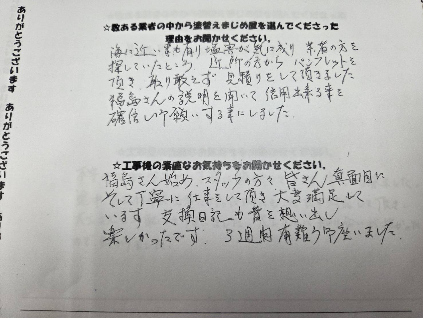 「真面目に、そして丁寧に仕事をしていただき大変満足しています」とのお言葉、社名に「まじめ」を掲げる私どもにとって、これ以上ないお褒めの言葉です。また、交換日記も楽しんでいただけたと伺い、私たちも嬉しい気持ちでいっぱいです。