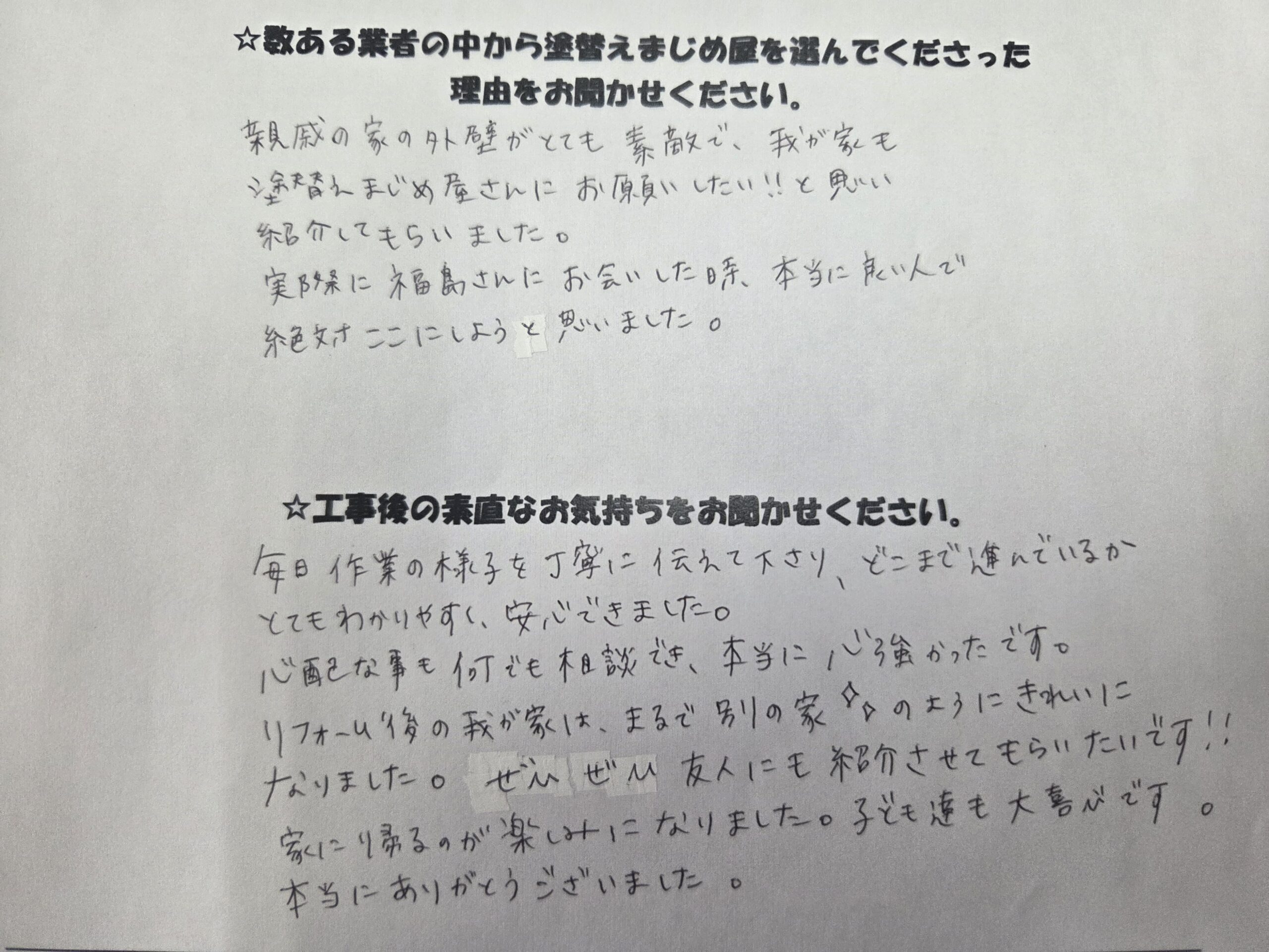 親戚の家の外壁がとてもきれいで、我が家も塗り替えまじめ屋さんにお願いしたい‼と思い、紹介してもらいました。