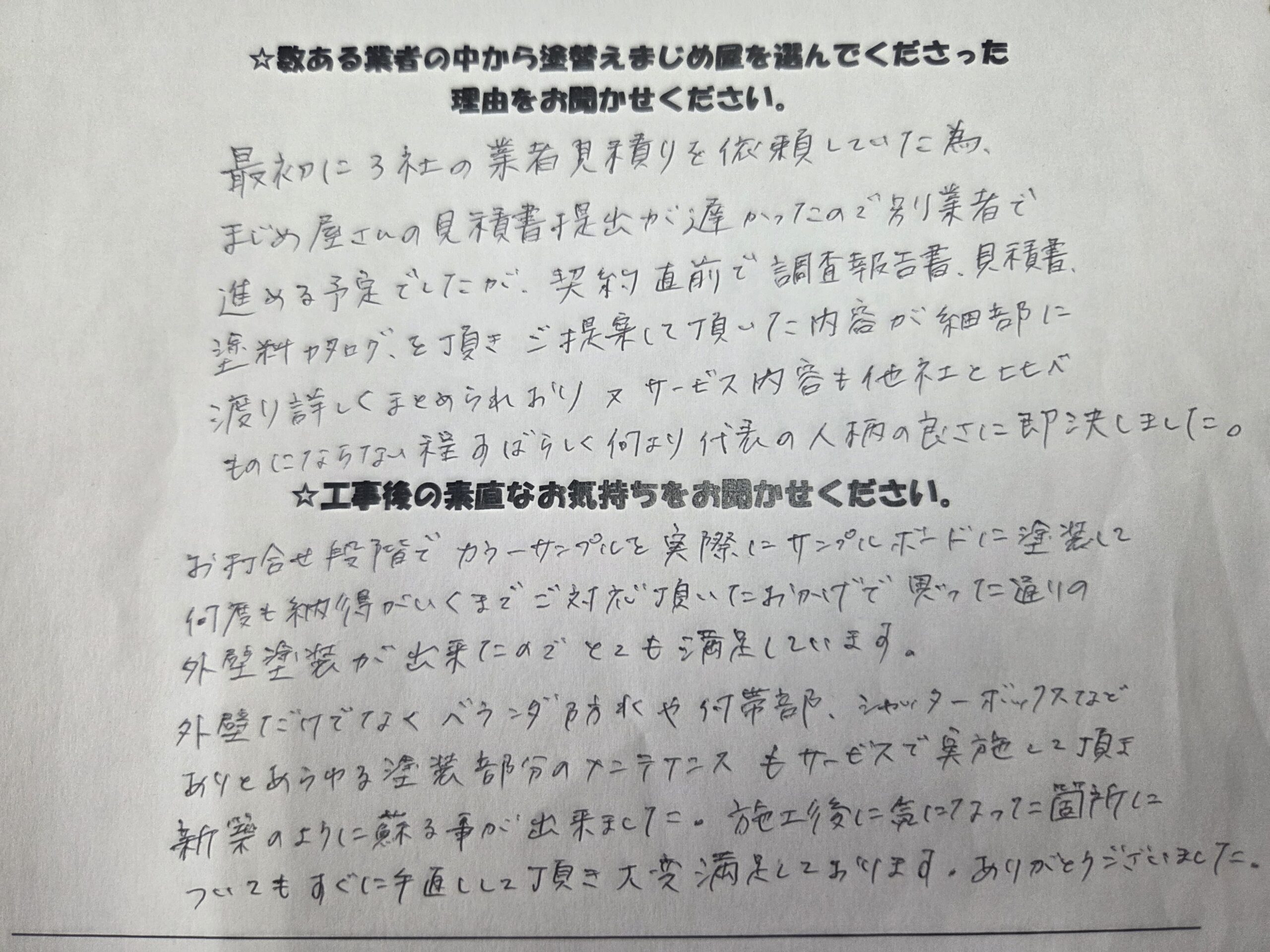 最初に3社の業者見積を依頼していたため、まじめ屋さんの見積書提出が遅かったので別業者で進める予定でしたが、契約直前で調査報告書、見積書、塗料カタログを頂き、ご提案していただいた内容が細部に渡り、詳しくまとめられており、またサービス内容も他社と比べものにならないほど素晴らしく、何より代表の人柄の良さに即決しました。
