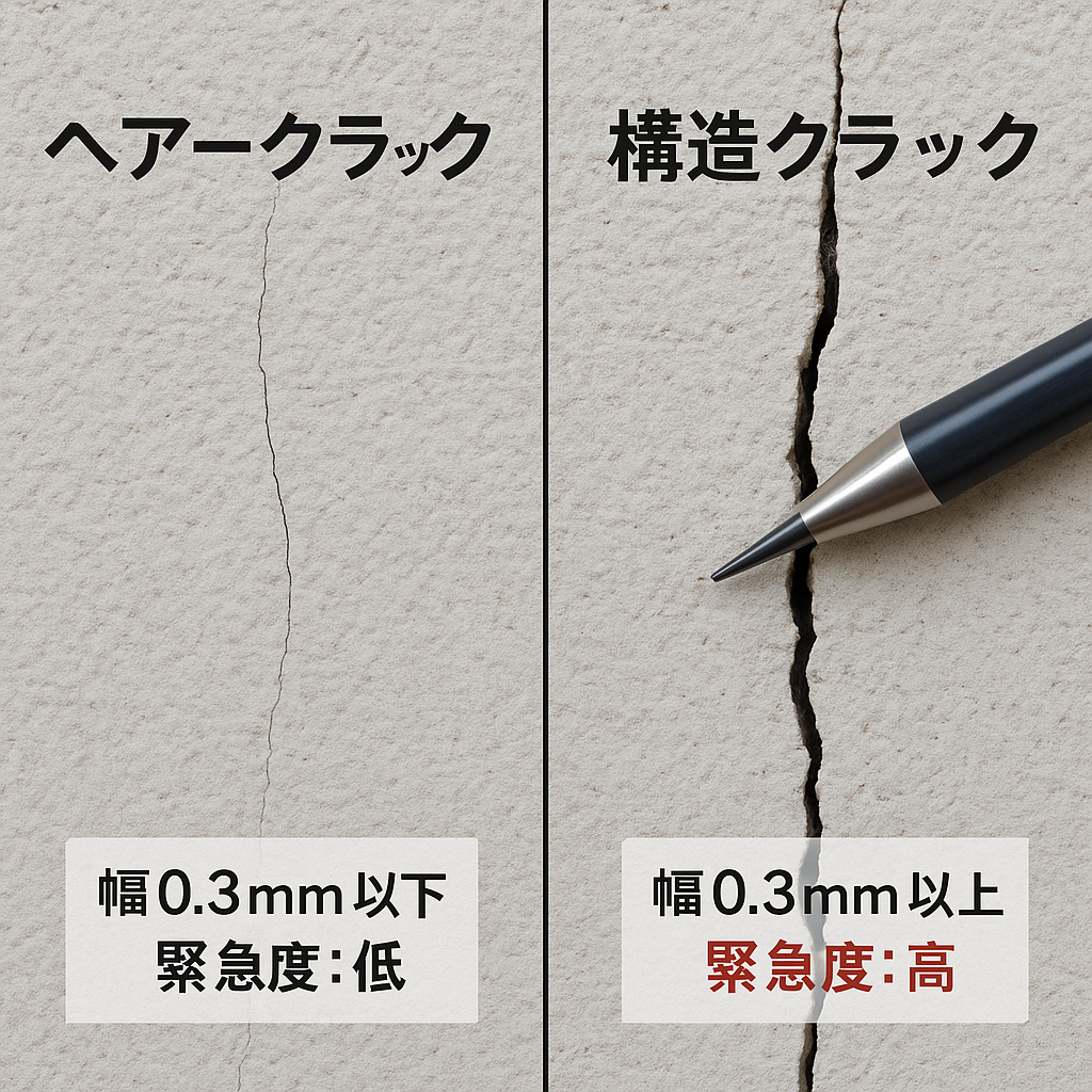ひび割れは、劣化サインの中でも特に注意が必要です。大きさによって危険度が異なります。
