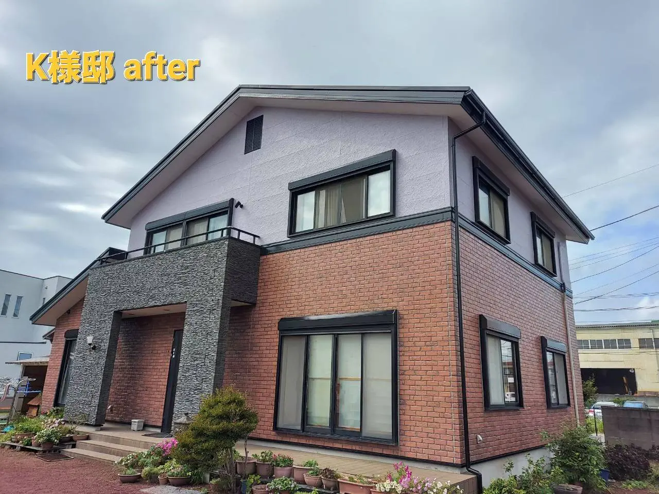 ②一階部分はクリアー塗装で、築年数にもよりますが新築の様に仕上がりました。二階部分は紫色系のグレイス・ラベンダーというお洒落な色です。