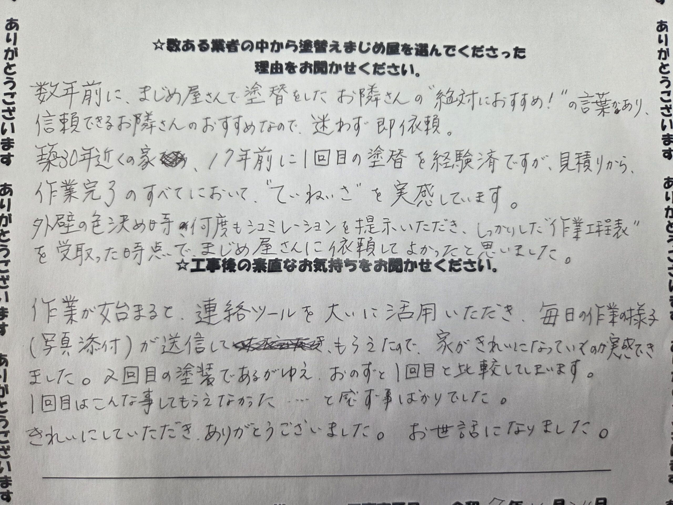 数年前に、まじめ屋さんで塗替えをしたお隣さんの”絶対におすすめ!”の言葉があり、信頼できるお隣さんのおすすめなので、迷わず即依頼。