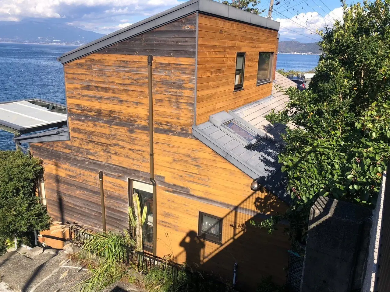 ②外壁が羽目板で海からの強風と塩害で痛みが見られました。しっかりと下地処理を行い塗装を行いました。