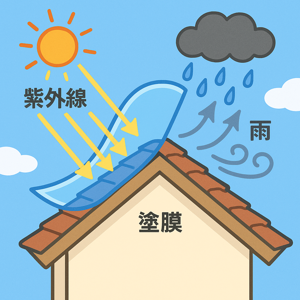 普段あまり意識することのない屋根ですが、実は外壁以上に過酷な環境に晒されています。真上から容赦なく降り注ぐ紫外線や雨風を24時間365日受け止め、私たちの暮らしを守ってくれているのです。 そんな屋根の塗装が劣化すると、様々な問題が起こり始めます。屋根塗装には、主に以下のような重要な役割があります。