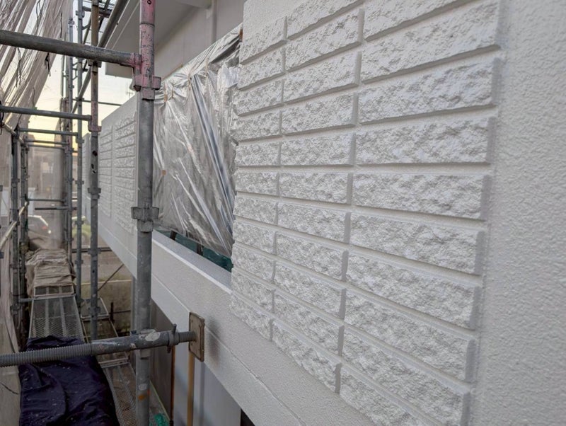 本日も、沼津市神田町の現場にて、タイル調のモルタル壁の外壁の中塗り作業を行いました🥹