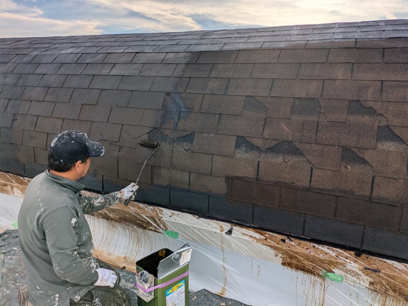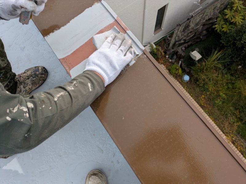 アスファルトシングル屋根の中塗り(防水樹脂)作業です。本日はここまでとなります。