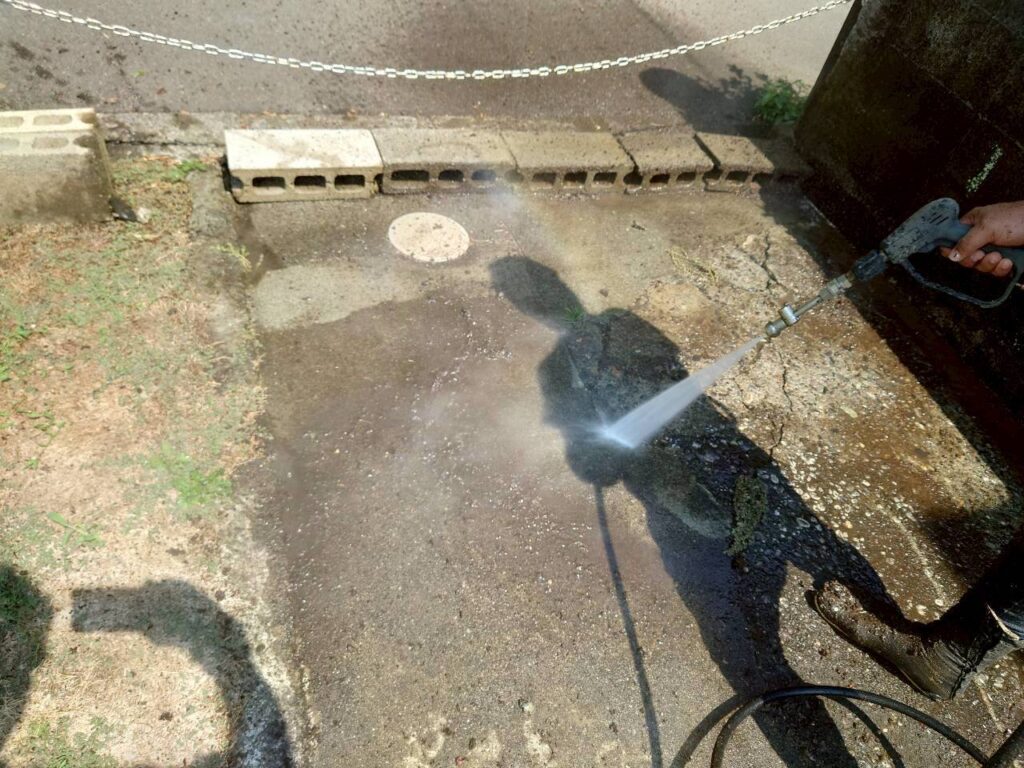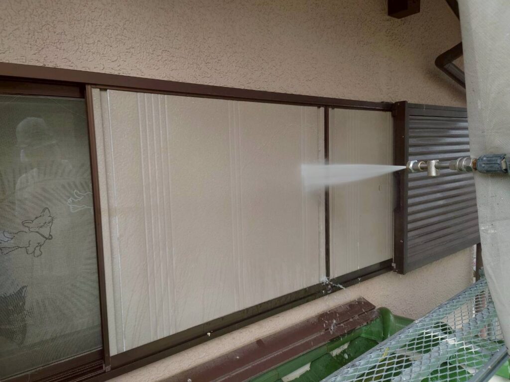塗装工事は、まずお住まい全体の汚れを洗い流すことから始まります。外壁はもちろん、雨戸やサッシの溝、基礎部分に至るまで、長年蓄積された汚れやコケ、古い塗膜を徹底的に除去します。