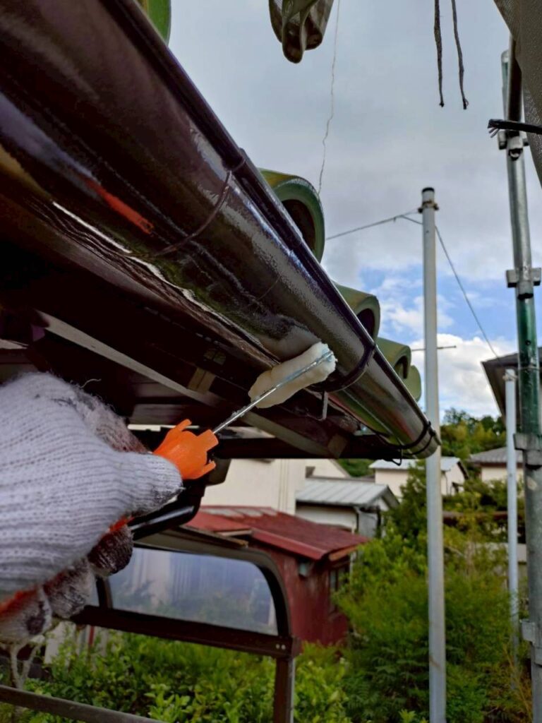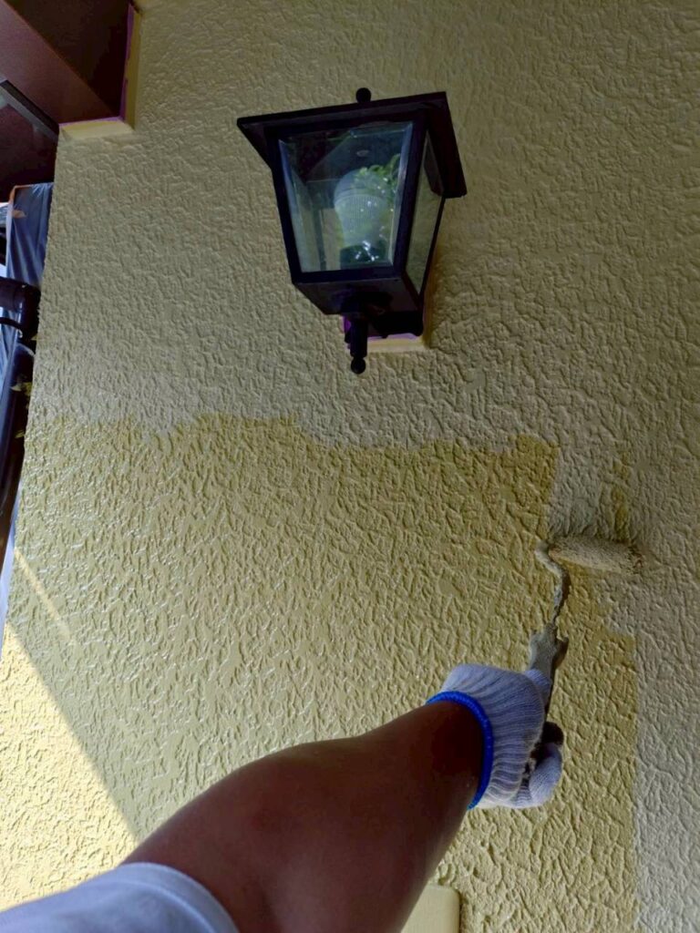 今回の工事で最も重要な工程の一つが、この軒天のケレン作業です。写真のように、パリパリに剥がれてしまった古い塗膜を、スクレーパーという道具で完全に除去します。この作業を疎かにすると、どんなに良い塗料を塗っても数年で剥がれてしまうため、一切の妥協が許されません。