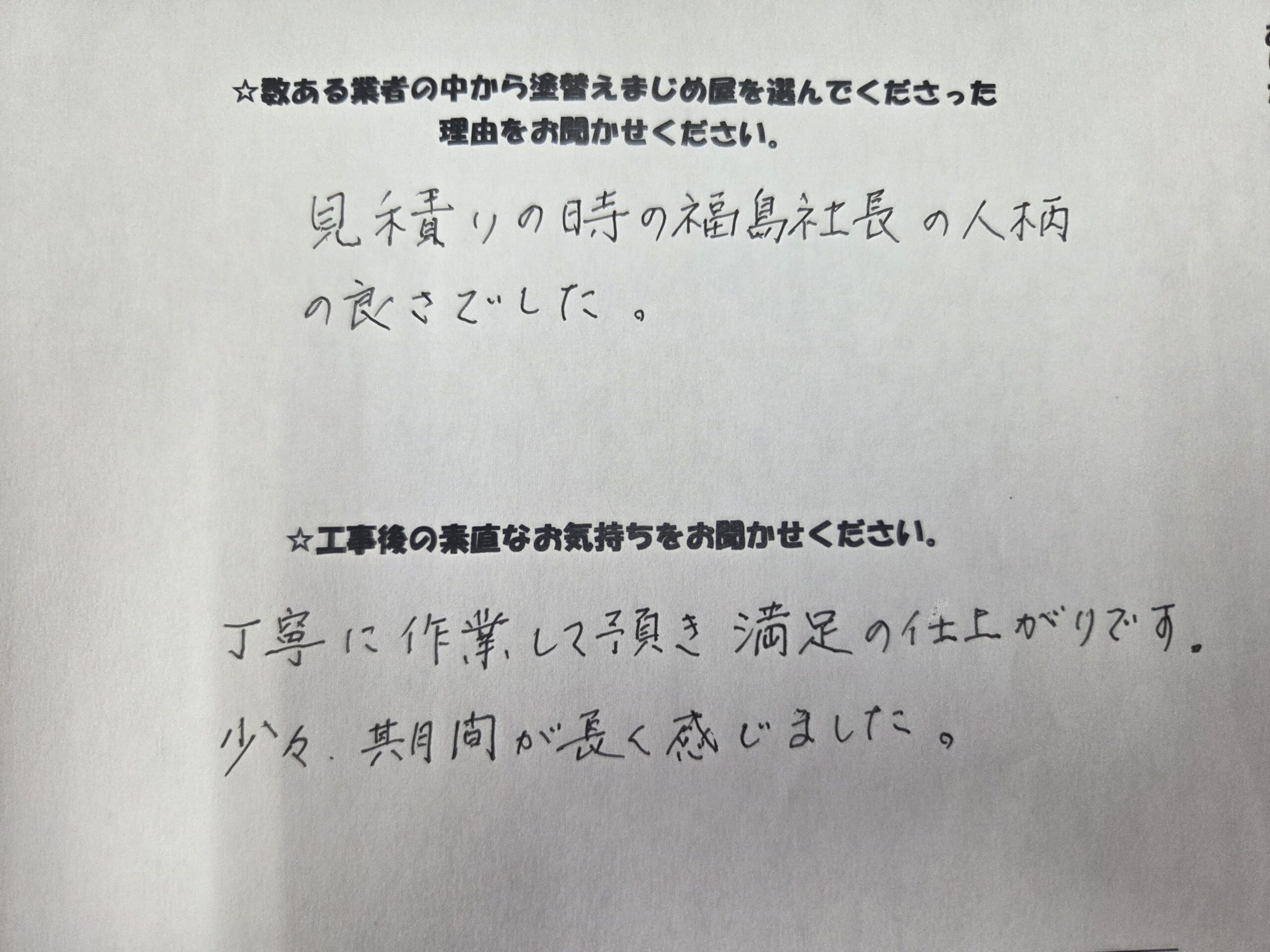 口コミ評判社長の人柄を信頼して依頼。期待通りの丁寧な作業で、満足のいく仕上がりになりました。沼津市 原町中 I様Q.どうして塗替えまじめ屋沼津店を選んでくれたのですか?見積りの福島社長の人柄の良さでした。Q.今の気持ちを教えて!丁寧に作業して頂き、満足の仕上がりです。少々、期間が長く感じました。無料お見積はこちら