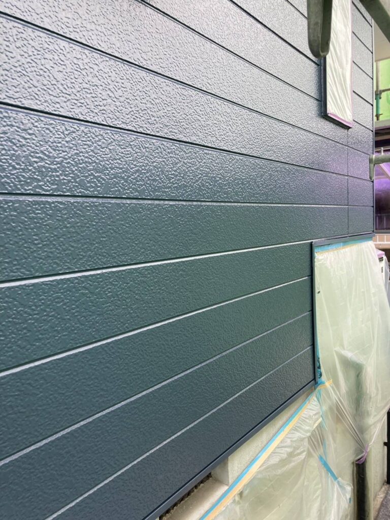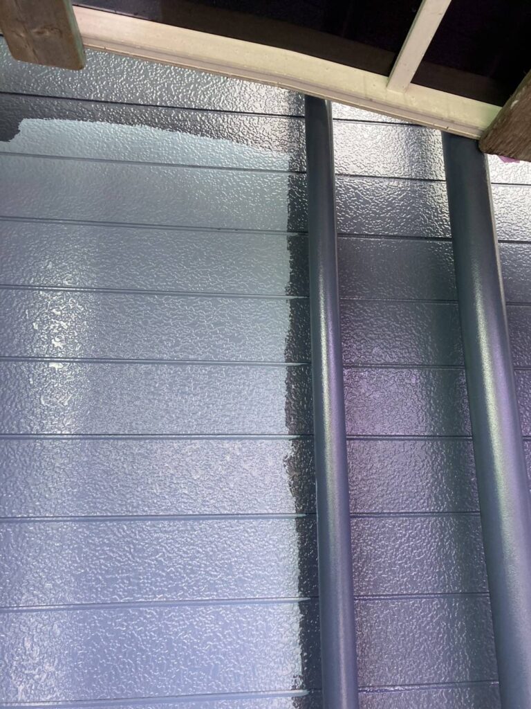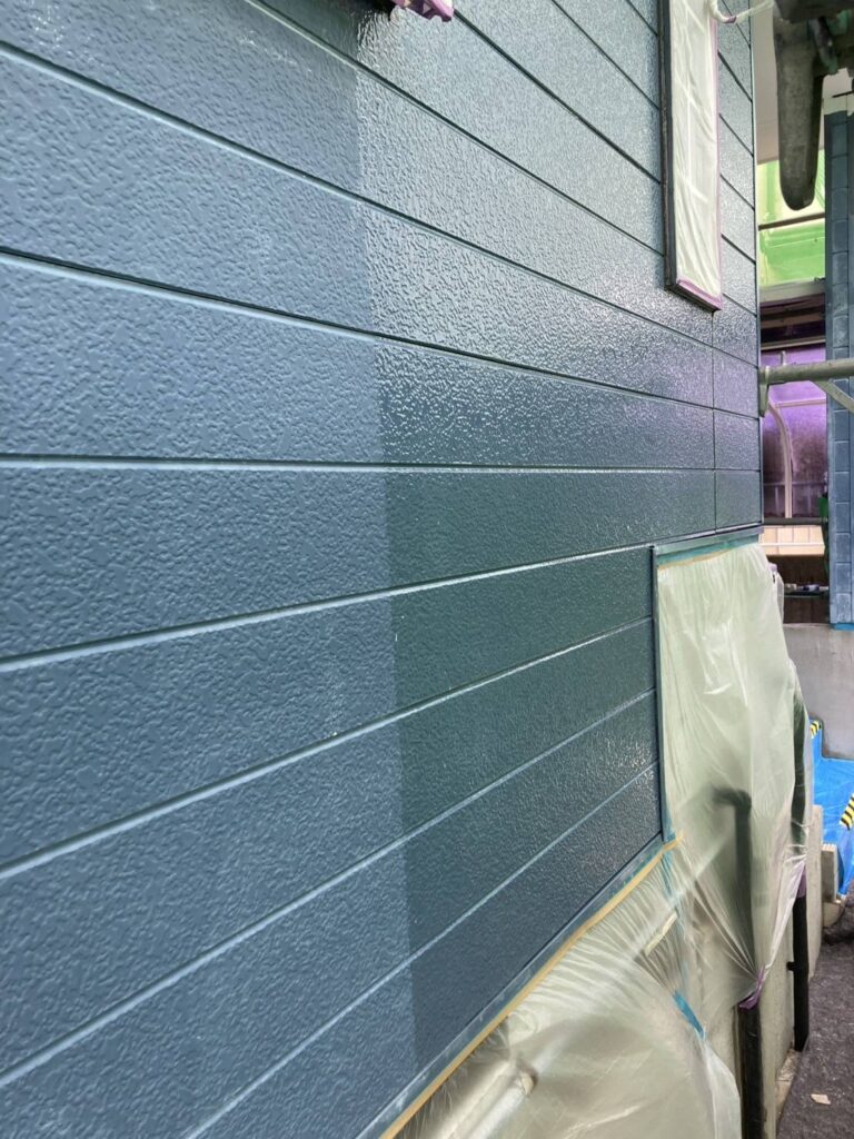 下地が完成したら、いよいよお客様にお選びいただいた色で塗装していく「中塗り」です。今回は深みのあるモダンなブルー系のお色。艶やかな塗料が壁に乗ることで、お住まいの印象が一気に変わっていきますね。写真でも、塗装した部分の美しい艶と深みが伝わってきます。