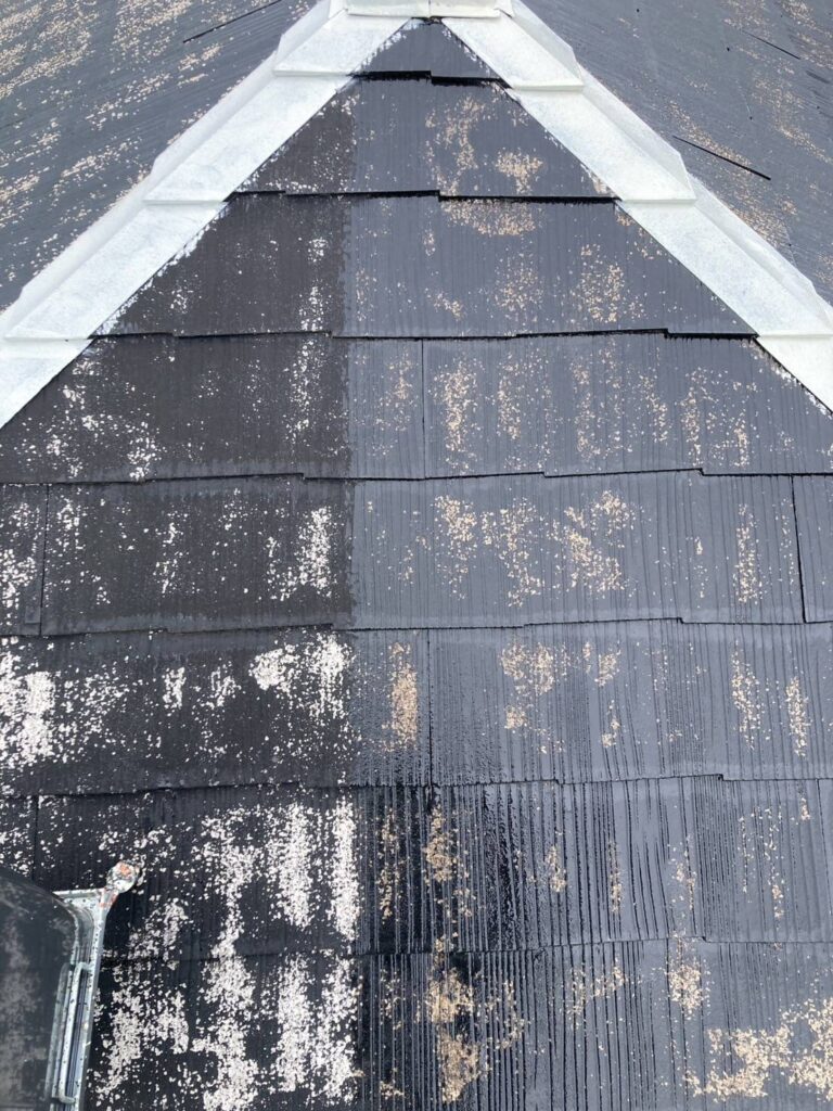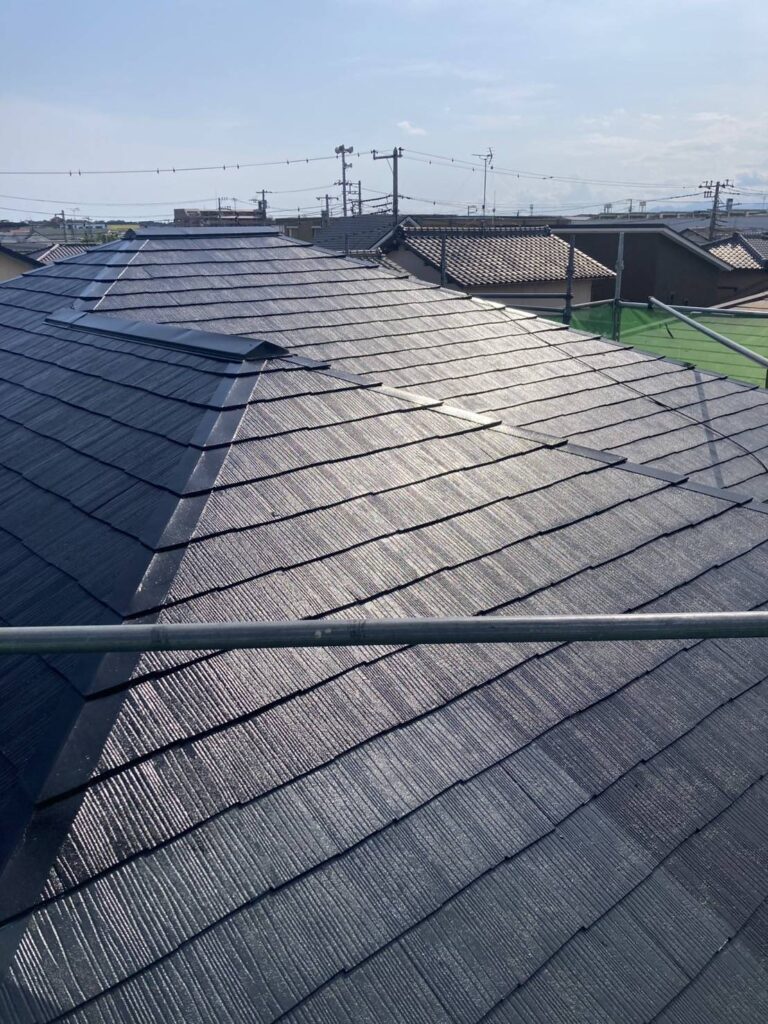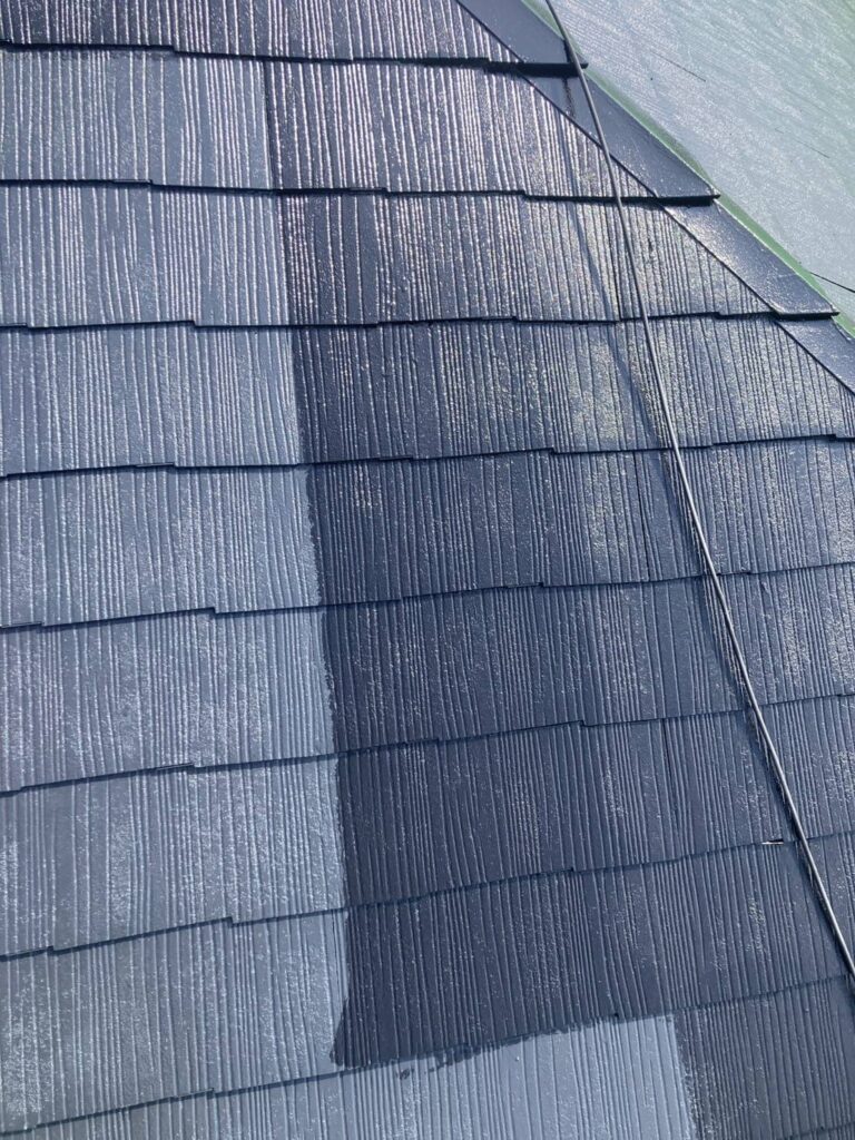あれほど傷んでいた屋根も、中塗りの工程で均一な黒色に仕上がってきました。屋根材の細かい模様(目地)を消してしまわないよう、適切な塗布量を守りながら、丁寧に塗り進めていきます。この中塗りで、塗膜の厚みを確保し、防水性能を高めていきます。