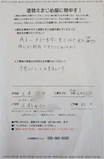 口コミ評判すごく気配りがありました。 カスタマーレビュー ★★★★★ Q.どうして『塗替えまじめ屋沼津店』を選んでくれたのですか? たまたま犬の散歩中、知り合いの工事を見かけ名刺をいただいたのがきっかけです。長持ちが期待できる塗料...