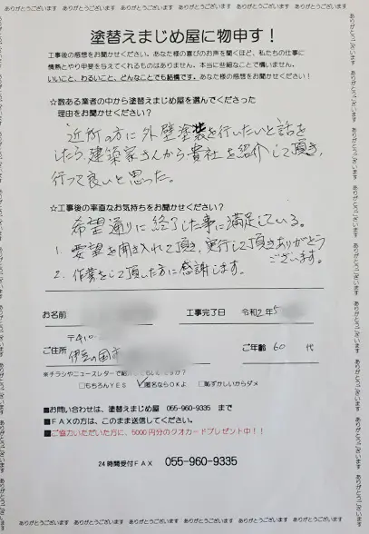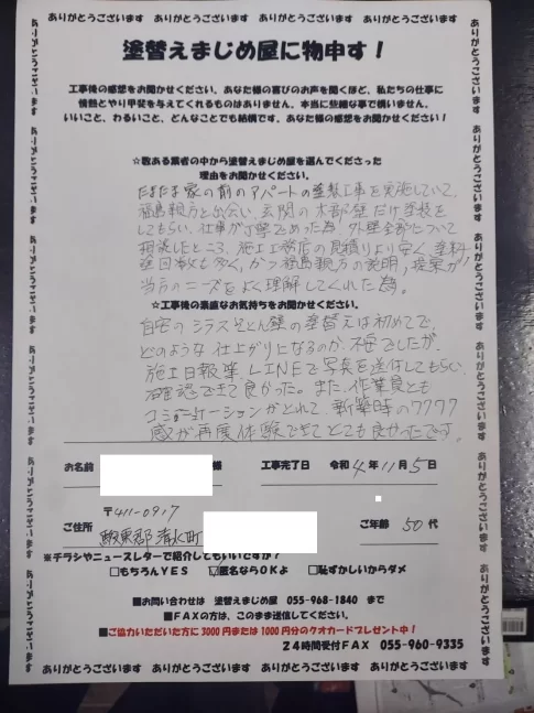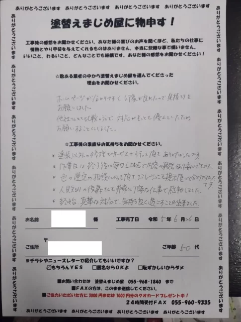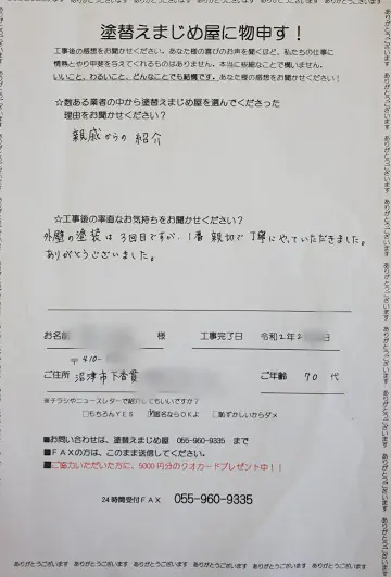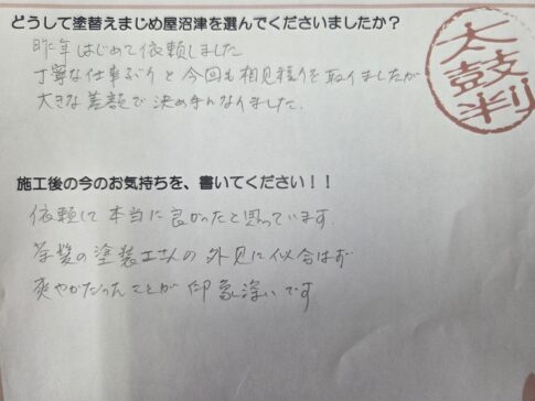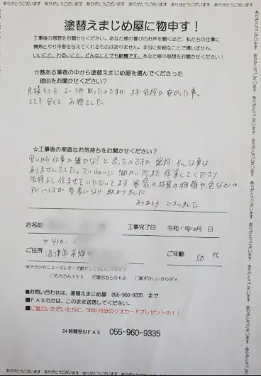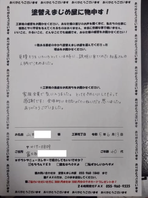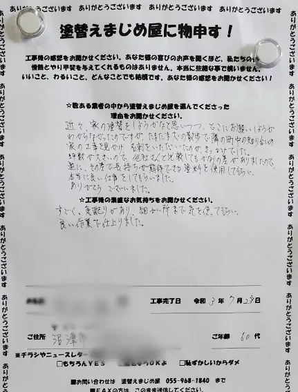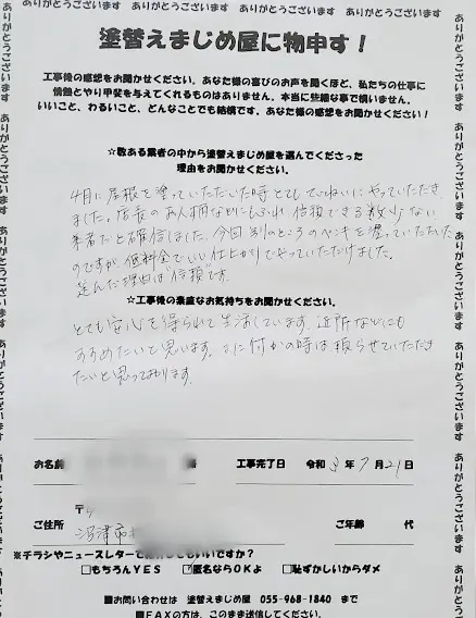 沼津市 鳥谷 K様 Q.どうして塗替えまじめ屋沼津店を選んでくれたのですか? 昨年初めて依頼しました。丁寧な仕事ぶりと今回も相見積もりを取りましたが、大きな差額で決め手になりました。 Q.今の気持ちを教えて! 依頼して本...