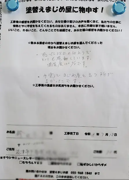 口コミ評判手塗でまじめ屋というチラシに惹かれました。 カスタマーレビュー ★★★★★ Q.どうして『塗替えまじめ屋沼津店』を選んでくれたのですか? 手塗でまじめ屋というところがよかったです。 Q.今の気持ちを教えて! 思った以上の...