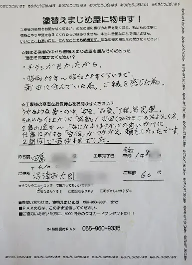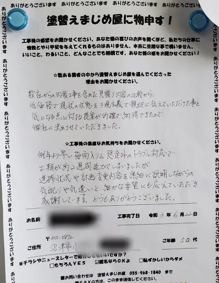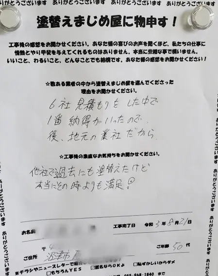 口コミ評判6社の相見積もりの中から選びました。 カスタマーレビュー ★★★★★ Q.どうして『塗替えまじめ屋沼津店』を選んでくれたのですか? 6社見積りした中で、1番納得がいったので。後、地元の業者だから。 Q.今の気持ちを教えて...