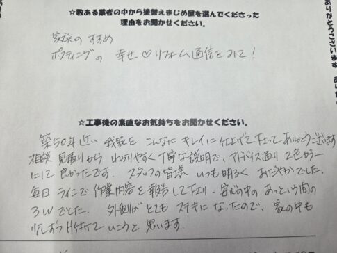 口コミ評判沼津市 原町 M様 Q.どうして塗替えまじめ屋沼津店を選んでくれたのですか? 家族のすすめポスティングの幸せリフォーム通信を見て! Q.今の気持ちを教えて! 築50年近い我が家をこんなにキレイに仕上げてくださってありがと...