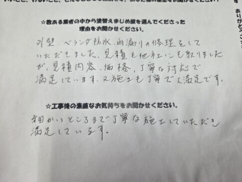 口コミ評判沼津市 岡一色 T様 Q.どうして塗替えまじめ屋沼津店を選んでくれたのですか? 外壁、ベランダ防水、雨漏りの修理をしていただきました。見積も他社にも取りましたが、見積内容、価格、丁寧な対応で満足しています。また施満足です...
