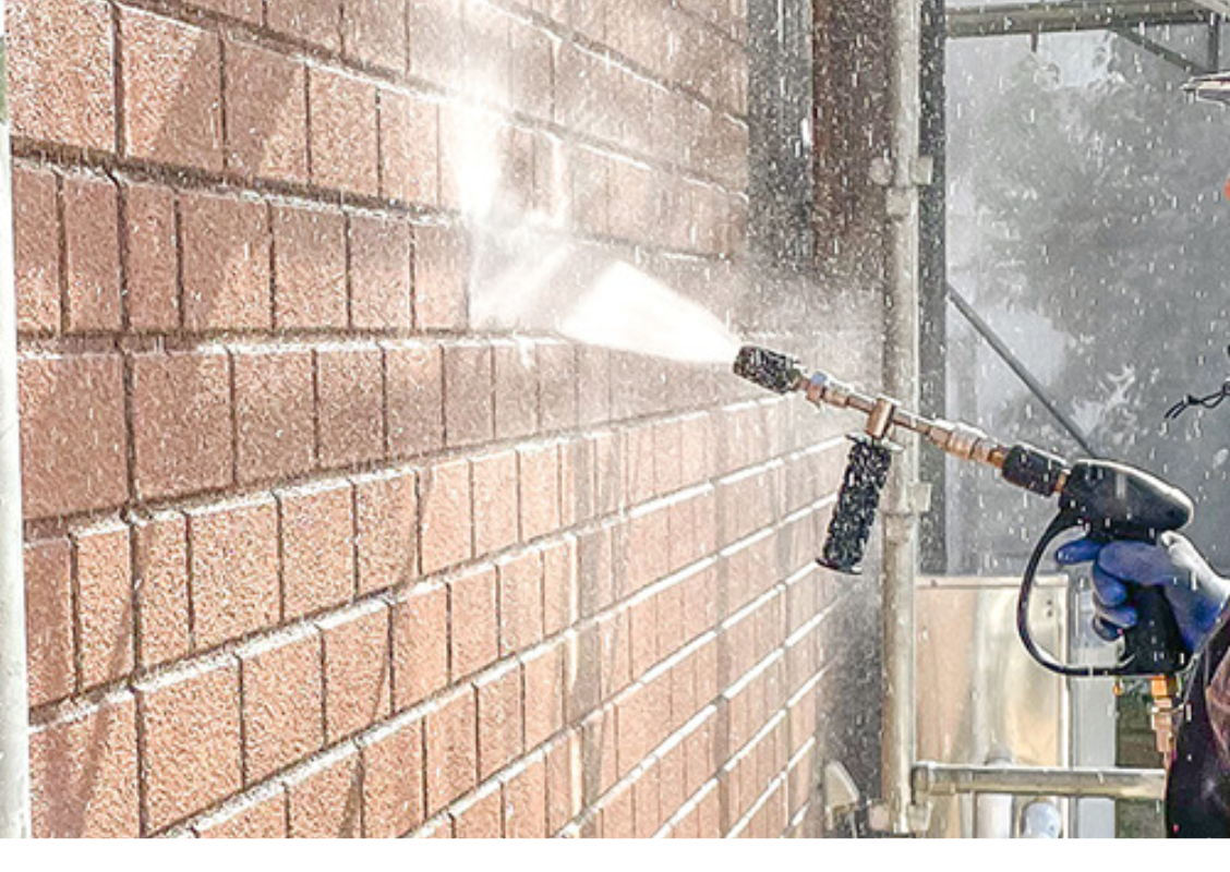 足場架設の次には、高圧洗浄を行います。高圧洗浄では、塗装をする前に、外壁についている汚れや不純物、特にコケやカビ、チョーキング現象によって浮き出た粉などをしっかり取り除き、塗装に適する塗布面に仕上げることが目的です。